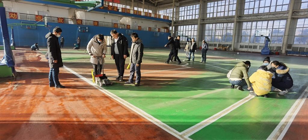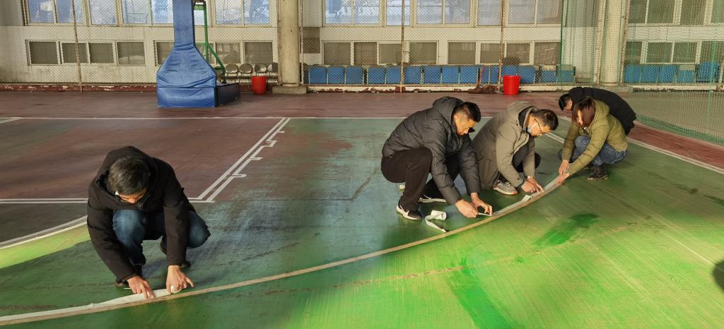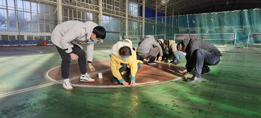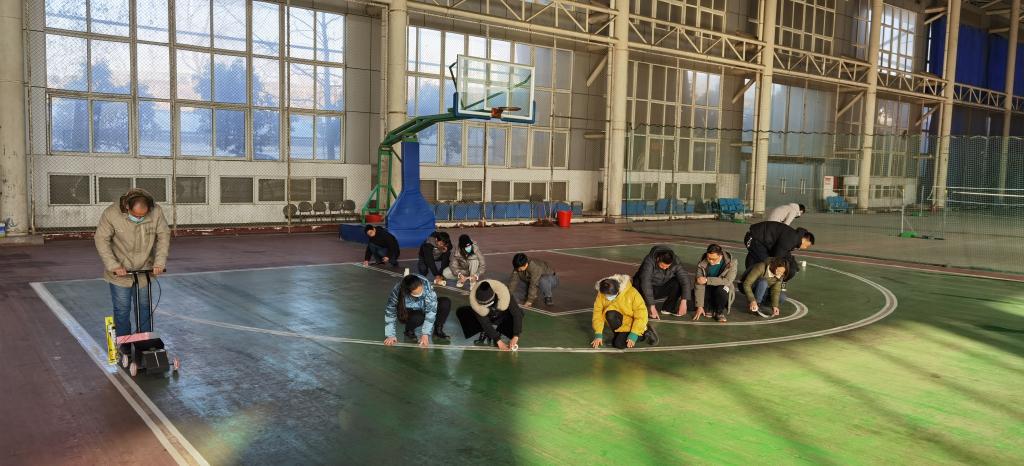 为避免造成材料浪费,该部教师多次精确核对场地尺寸数据,准确核算所需材料数量。在画线过程中,该部体育老师不怕脏不怕累,有的贴美纹纸、有的清扫场地、有的操作画线机进行画线,大家不畏严寒,相互配合,画线工作有序推进。
