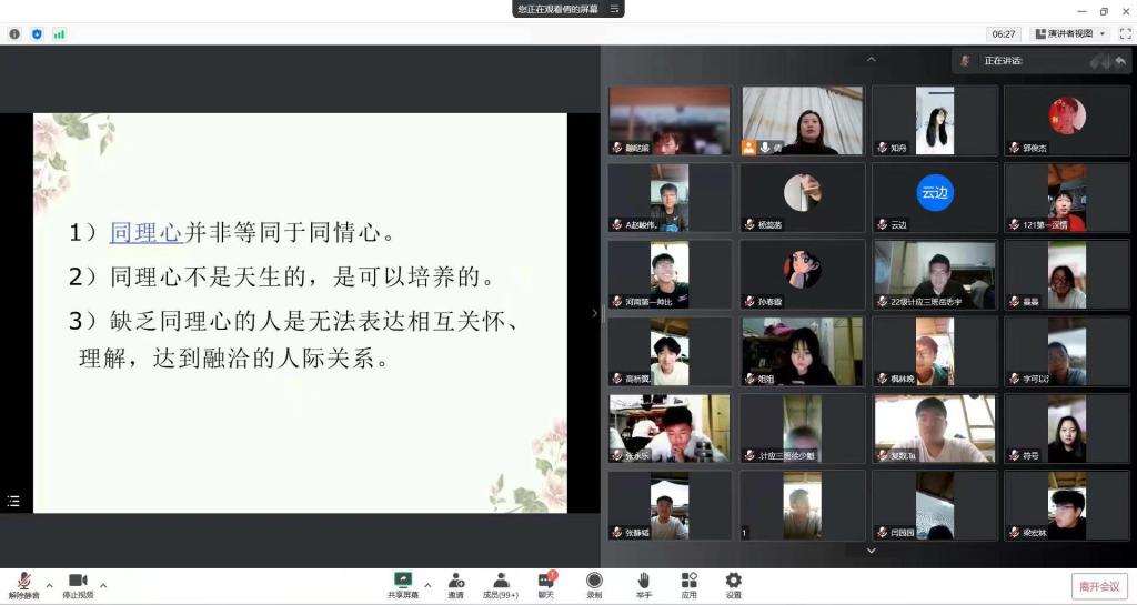 为充分发挥班级心理委员、宿舍心理信息员在大学生心理健康教育中的作用,提高朋辈心理帮扶能力,从10月29日起心理咨询教育中心对各院部2022级的345名班级心理委员和1325名宿舍心理信息员和微笑心理协会全体成员进行6场次的线上培训,使其明确工作职责,掌握朋辈心理辅导的基本方法和工作原则,鼓励同学们主动学习心理健康知识,学会自我关怀,促进自我完善,同时力所能及的去帮助身边的同学,达到助人自助,共同成长的发展目标。