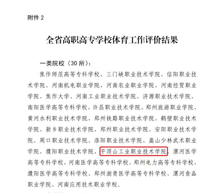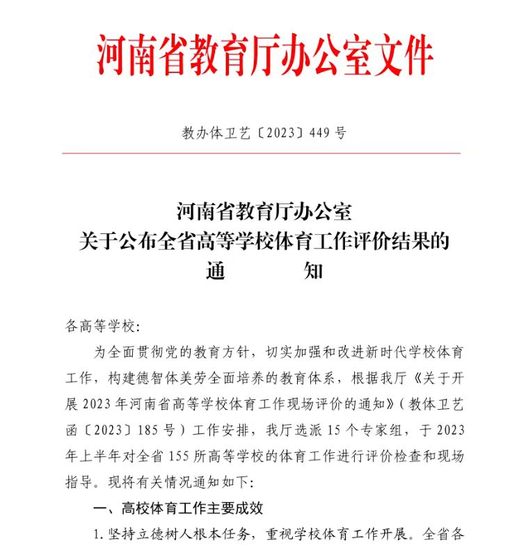 12月15日,河南省教育厅办公室下发全省体育工作评价结果文件,我校在全省155所高等院校中荣获一类院校,这是对我校高度贯彻党的教育方针,提高体育教育教学质量,积极落实德智体美劳五育并举体系的综合评价。