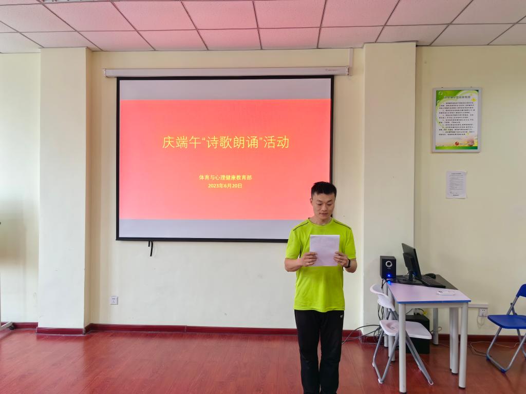 2023年6月20日,为深入学习宣传贯彻党的二十大精神,大力培育和践行社会主义核心价值观,感受传统文化魅力,增强爱国主义情感,弘扬爱国主义精神,体育与心理健康教育部在心理团辅室开展“以诗歌为名,与端午干杯”经典诵读比赛活动,体育与心理健康教育部教师参与本次活动,奉献了一场朗诵盛宴,精彩的朗诵赢得大家的阵阵掌声。