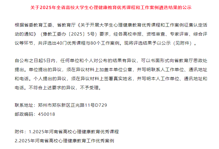 4月18日,河南省教育厅公布2025年全省高校大学生心理健康教育优秀工作案例遴选结果,我部王一飞老师的案例成功入选。