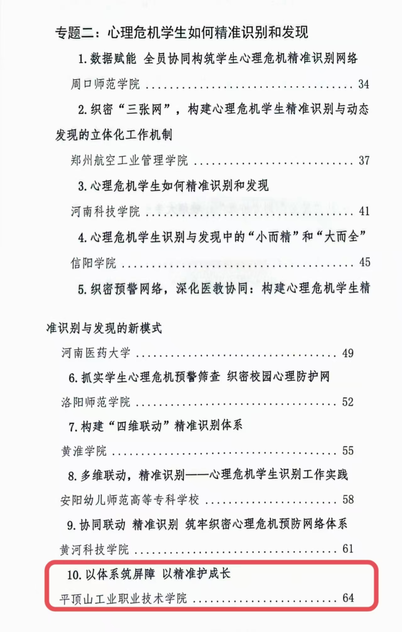 近日,我校报送《以体系筑屏障以精准护成长》的心理育人实践案例成功入选全省高校心理健康教育优秀案例。该案例以“三位一体”危机识别体系和“3+3+3”心理干预体系的特色模式,系统阐述了我校如何精准识别和干预心理危机学生,获得评审专家的高度认可,充分展现了我校心理育人工作的系统性和实效性。