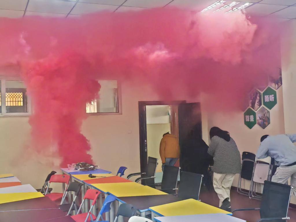 在消防演练环节,当烟雾弹燃气时,教职工严格遵循“弯腰低姿、捂鼻前行、靠右有序”规范,沿预定路线快速撤离至安全区域,全程紧张有序、衔接顺畅,有效固化了疏散流程记忆。