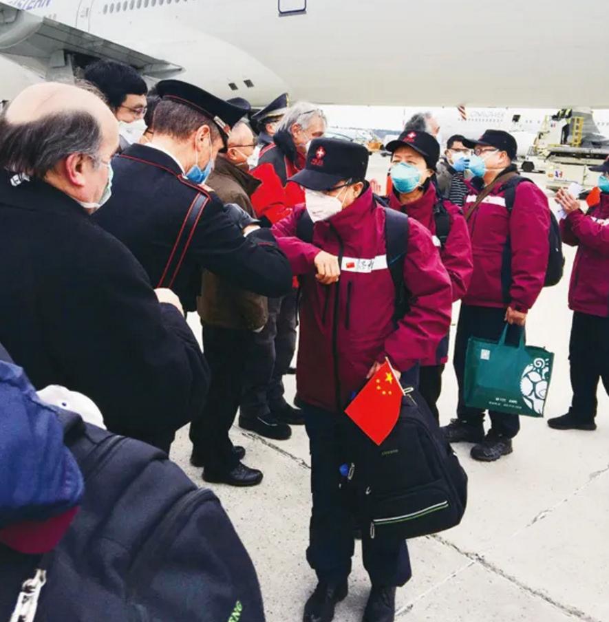 (2020年3月25日,在意大利米兰马尔奔萨机场,意方人员以“击肘”的方式欢迎中国第三批赴意大利抗疫医疗专家组成员的到来。中国第三批赴意大利抗疫医疗专家组一行14人25日抵达米兰马尔奔萨机场。专家组由国家卫生健康委员会组建,成员由福建省卫健委选派,并随所乘飞机携带了呼吸机、监护仪、口罩等中方捐助的医疗物资。新华社发)