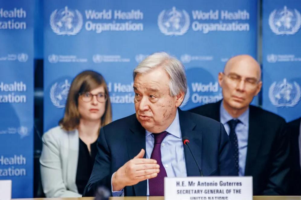 (2020年2月24日,联合国秘书长古特雷斯(前)在瑞士日内瓦世界卫生组织总部发表讲话。古特雷斯表示,中国实施严格的防控措施,以牺牲正常生活的方式为全人类作出了贡献。古特雷斯当日造访日内瓦世卫组织总部,并与世卫组织各部门负责人举行座谈。新华社发)