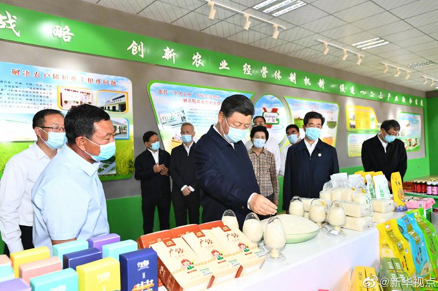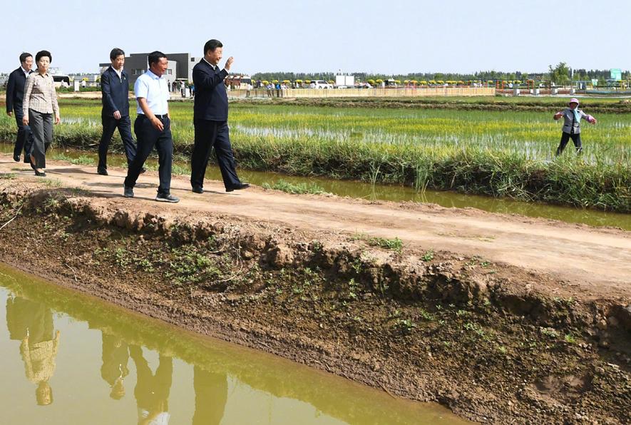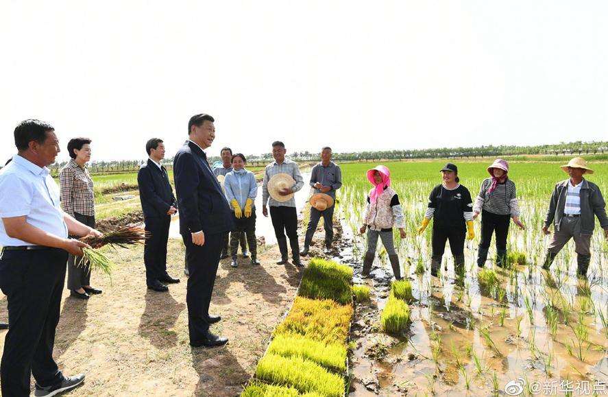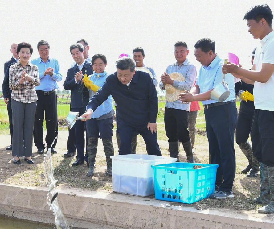 在黄河水滋养下,宁夏平原土地肥沃、物产丰富,素有“塞上江南”之称。9日下午,习近平来到银川市贺兰县稻渔空间乡村生态观光园,听取宁夏现代农业发展、农业合作社带动农民增收致富运营模式等情况汇报,观看宁夏特色农产品展示,了解稻渔种养业融合发展的创新做法。习近平登上观景塔,俯瞰园区全貌。微风轻拂,秧苗摇曳,一派生机勃勃。他沿着田埂走进稻田,同正在劳作的村民们亲切交谈。村民们告诉总书记,现在有土地流转费、劳务费,还有年底分红,收入提高了,也有保障了。正值放鱼时节,习近平舀起鱼苗、蟹苗,放进田边水渠。习近平强调,发展现代特色农业和文化旅游业,必须贯彻以人民为中心的发展思想,突出农民主体地位,把保障农民利益放在第一位。要探索建立更加有效、更加长效的利益联结机制,确保乡亲们持续获益。要注意解决好稻水矛盾,采用节水技术,积极发展节水型、高附加值的种养业,保护好黄河水资源。目前,疫情防控形势稳步向好,要继续抓好常态化疫情防控,加快恢复社会生产生活正常秩序。