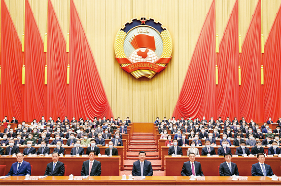 2022年3月4日,中国人民政治协商会议第十三届全国委员会第五次会议在北京人民大会堂开幕。这是习近平、李克强、栗战书、王沪宁、赵乐际、韩正、王岐山在主席台就座,汪洋代表政协第十三届全国委员会常务委员会向大会报告工作。 新华社记者 黄敬文/摄