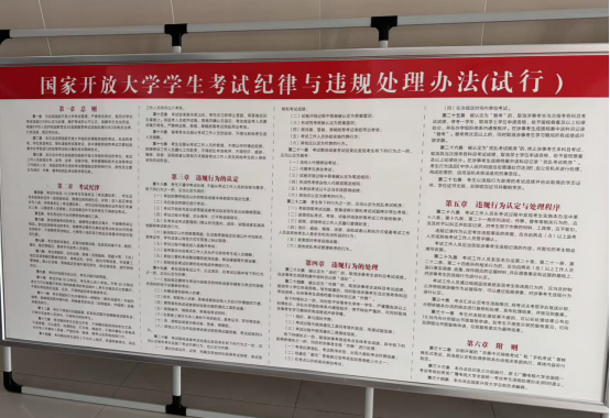 考场环境:严格按照国家标准设置考场,配备保密室、监控设备,背景悬挂醒目标语“替考违规 取消成绩 停考一年 全国通报”,考场门口摆放《国家开放大学学生考试纪律与违规处理办法(试行)》宣传排版,强化考试纪律宣传。