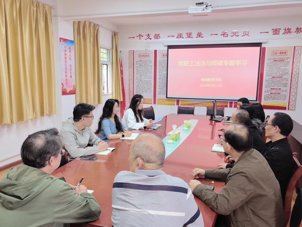 为全面加强教职工队伍思想政治建设和师德师风建设,提升全体职工法治素养与职业素养,4月13日,继续教育学院在党员活动室组织开展教职工法治与师德专题学习活动,学院全体职工参加此次学习。