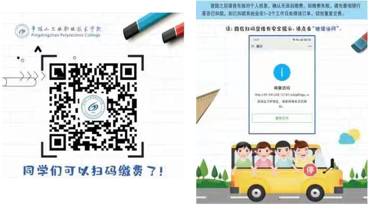 手机端缴费:微信或支付宝扫描平顶山工业职业技术学院缴费二维码,此为平顶山工业职业技术学院手机端缴费唯一官方通道。扫描上图“二维码”->点击“继续访问”、登录(用户名为学号、初始密码为身份证号后六位,也可以选择身份证号码输入姓名登陆,)->修改密码->选择缴费->完成缴费。缴费收据,开学后统一找班主任领取。