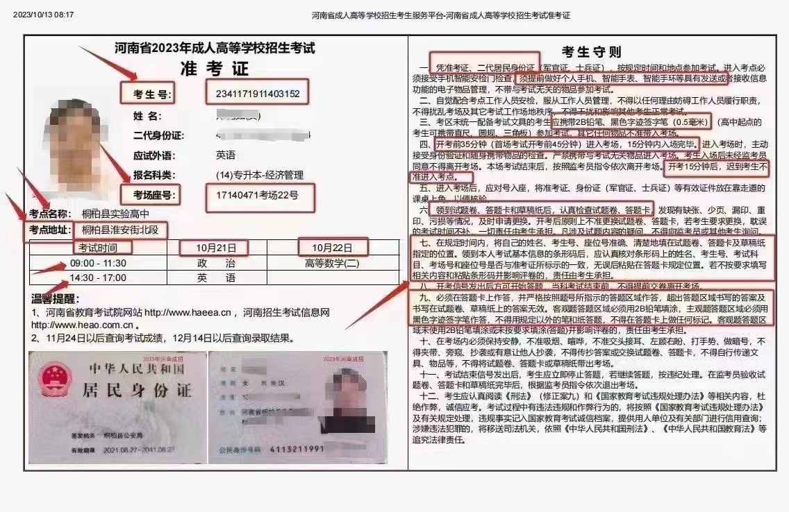 通过访问河南省教育考试院网站(http://www.haeea.cn),登录“河南省成人高校招生考生服务平台”,按提示要求通过个人信息验证后,打印准考证(A4纸,横向打印,黑白彩色均可)。如果横向打印出现多页情况,请手动设置页边距,保证准考证信息完整打印在一页上。打印成功后,请认真查看考试时间和考点地址,并阅读考生守则。
