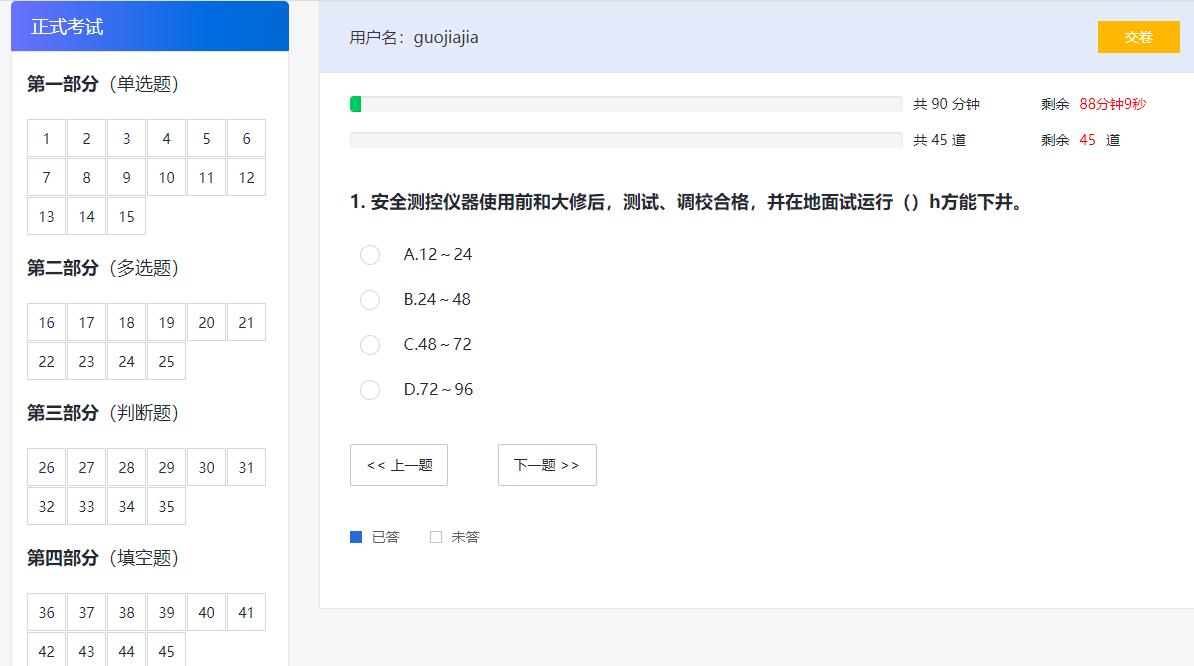 4.进入考试,完成作答后点击左上角“交卷”,即可查询该门课程的终考成绩。若不及格,请做补考1,若还不及格再做补考2。