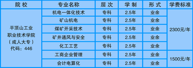 平顶山工业职业技术学院成人教育学院主要从事成人高等学历教育、培训、技能鉴定取证考试等工作。每年为企业和社会培养成人高等教育专科、专升本毕业生3000余人,为企业培训人员6000多人次、技能鉴定及取证考试9000多人。