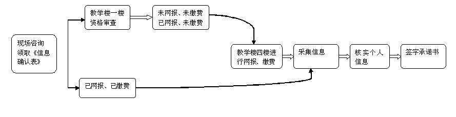 未进行网报、网上缴费的考生,先领取《信息确认表》后到一楼东边进行资格审查,然后到教学楼四楼微机室进行网报和缴费,;