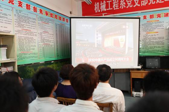 在机械工程系党支部,该支部通过计算机系统把实况转播投放到屏幕上,并组织了刚入党的学生党员和教师党员一起收看转播。获得“中国大学生自强之星”提名,刚刚成为中国共产党预备党员的孝子典型刘巍同学,在收看完转播实况之后深有感触的说,作为一名大学生,通过上午收看实况转播,对于我们党90周年的光辉历程和伟大成就有了更加深刻的认识,作为学生,我更加深刻认识到“没有共产党,就没有新中国”。今后我会不断提升自己学习能力,打好能力基础,为社会发展做出自己积极的努力。