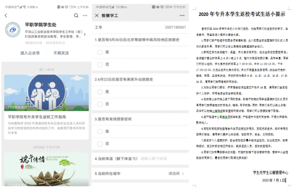 在开学之前,学校利用平职学院智慧校园系统全程监测考生相关行程及身体健康状况,并利用微信公众号、微信群等新媒体渠道及时发布了《平职学院2020年专升本学生返校考试工作指南》《平职学院2020年专升本学生返校报到流程》《校园封闭管理制度》《2020年专升本学生返校考试生活小提示》等十余项制度和规定,有效指导了学生安全有序返校。