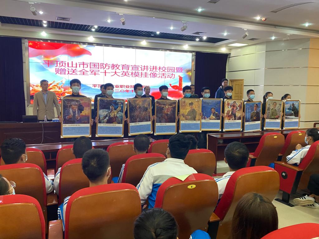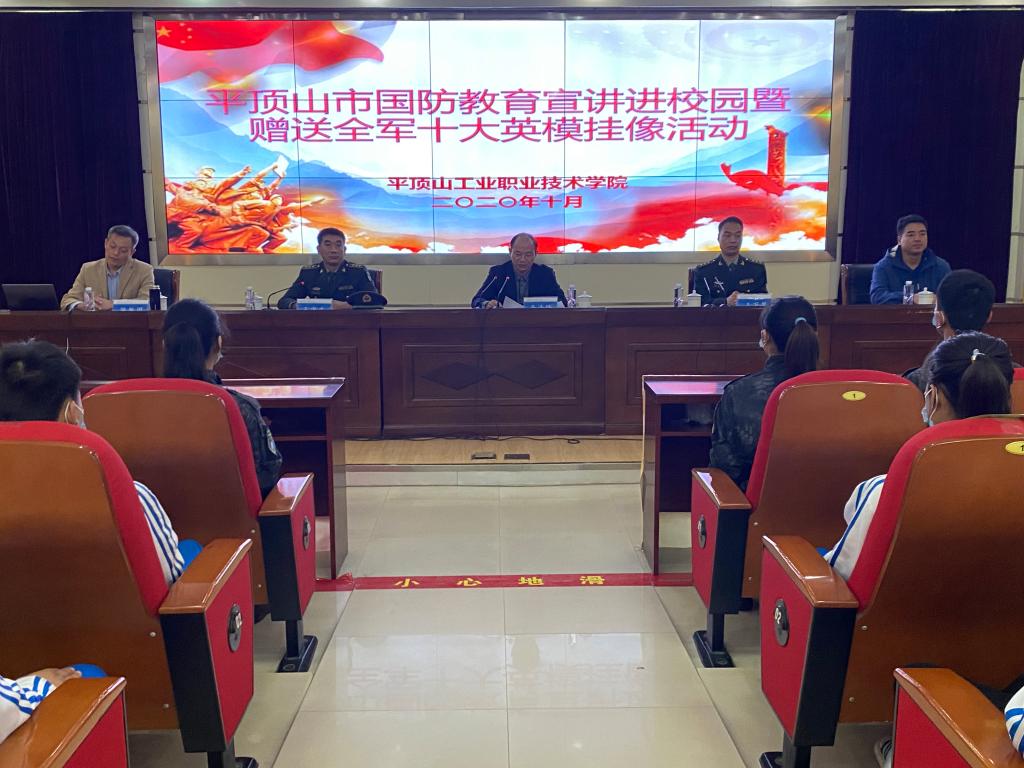 10月27日上午,河南省平顶山市国防教育宣讲进校园暨赠送全军十大英模挂像活动在我校图书馆报告厅举行。平顶山军分区政治工作处主任王万里、学校纪委书记李清锋、湛河区人民武装部政委王中生、平顶山市国防教育讲师团成员和300余名师生参加了活动。