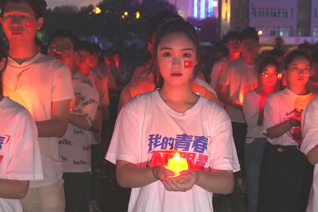 本次活动分为两场进行,分别播放了红色电影《我和我的祖国》和《红海行动》。活动伊始,上千名学生集体诵读感恩词,感恩祖国、师长的谆谆教导。随后,同学们手挥荧光棒,深情演唱《我和我的祖国》,演唱过程中一部分青年团员用双手举起红色烛灯,摆出党徽的造型,巨大的党徽图案展现在操场上空。他们用双手举起对祖国的热爱,以独特的方式来表达对党的无比敬意。