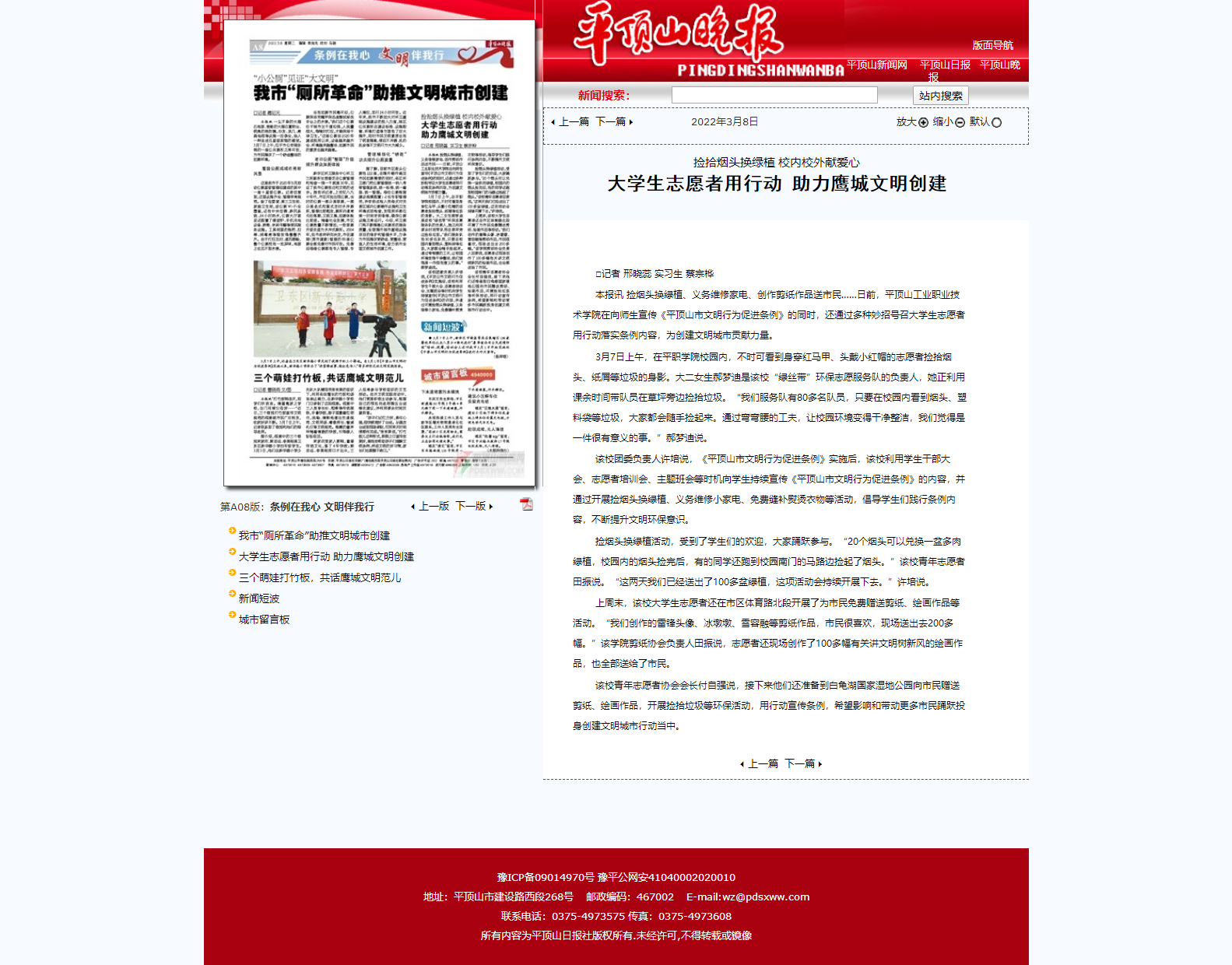 该校团委负责人许培说,《平顶山市文明行为促进条例》实施后,该校利用学生干部大会、志愿者培训会、主题班会等时机向学生持续宣传《平顶山市文明行为促进条例》的内容,并通过开展捡烟头换绿植、义务维修小家电、免费缝补熨烫衣物等活动,倡导学生们践行条例内容,不断提升文明环保意识。