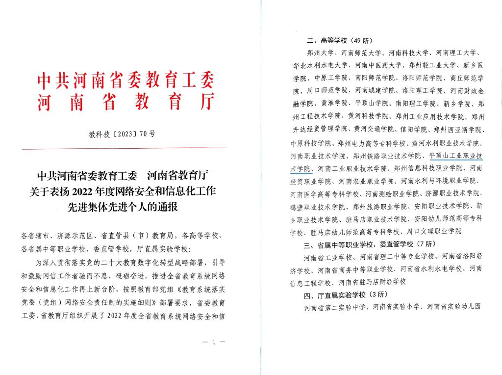 近日,中共河南省委教育工委、河南省教育厅发布《关于表扬2022年度网络安全和信息化工作先进集体先进个人的通报》(教科技〔2023〕70号),我校继2020、2021年度之后,再次被评为“网络安全和信息化工作先进集体”。