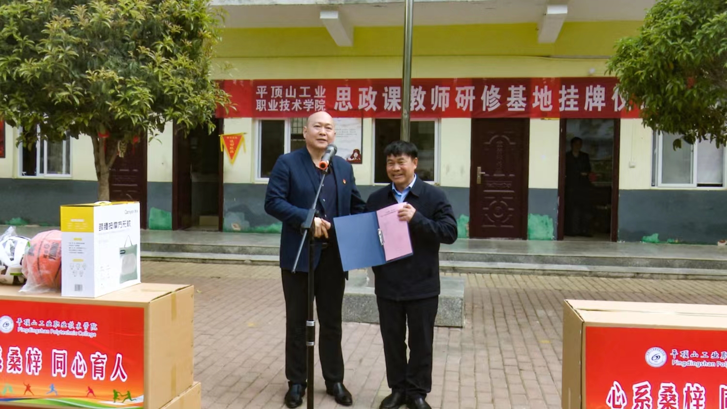 4月13日上午,学校在南阳市镇平县高丘镇黑虎庙小学隆重举行“平顶山工业职业技术学院思政课教师研修基地”挂牌暨捐赠仪式。学校党委书记毕晓阳,镇平县委副书记赵毅辉共同为研修基地揭牌。时代楷模、黑虎庙小学校长张玉滚,学校副校长刘怀珍,镇平县政府、高丘镇政府相关领导出席仪式。学校党委宣传部、马克思主义学院、安全培训中心相关负责人参加仪式。
