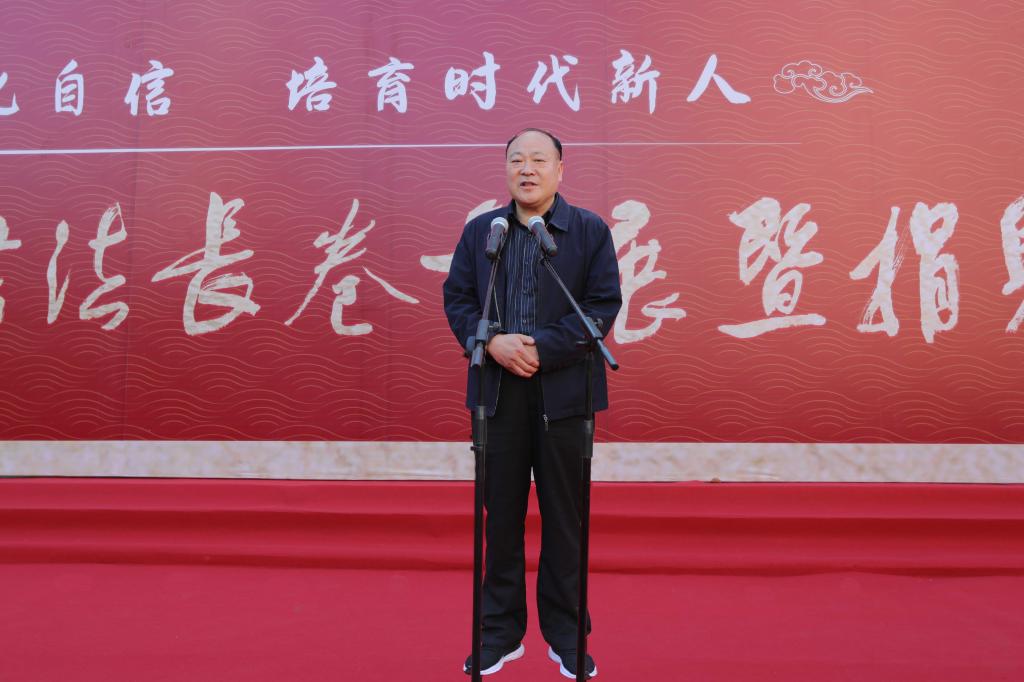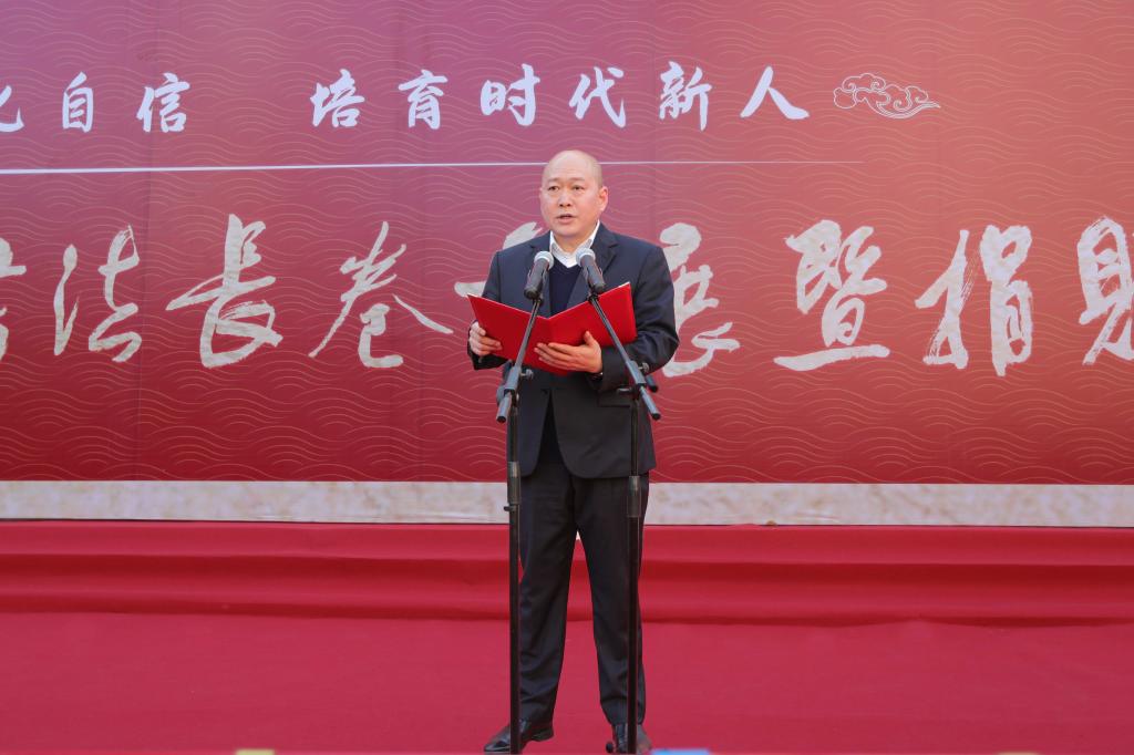 毕晓阳致辞中指出,举行陈大清小楷《党的二十大报告》书法长卷首展暨捐赠仪式,是深入开展学习贯彻习近平新时代中国特色社会主义思想主题教育的创新举措,是学习贯彻党的二十大精神的具体体现。他强调,一直以来,学校始终坚持社会主义办学方向,全面贯彻党的教育方针,认真践行“为党育人、为国育才”使命,落实立德树人根本任务,扎实推进“三个校园”建设,崇尚“以文化人、以文育人”氛围营造,注重在日常教学、德育活动中熏陶、培养当代青年学生的传统文化修养,让青年学生在传统文化的学习中不断地汲取民族精神,努力培养立大志、明大德、成大才、担大任的时代新人。他指出,陈大清同志作为中国煤矿文联书法家协会会员,其独树一帜的书法作品是渊博知识、深厚学养、娴熟技法的结晶。特别是《党的二十大报告》书法长卷26.8米,把书法艺术同党的政治理论进行深度融合,表达了一名共产党员对党和祖国的深厚感情。他希望,广大党员干部和师生员工以此次首展暨捐赠仪式为契机,在领略传统书法艺术魅力的同时,深学细悟、实干笃行,切实将思想和行动统一到党的二十大精神上来,把力量凝聚到党的二十大确定的各项任务上来,振奋精神、坚定信心,奋力开创学校高质量发展新局面。