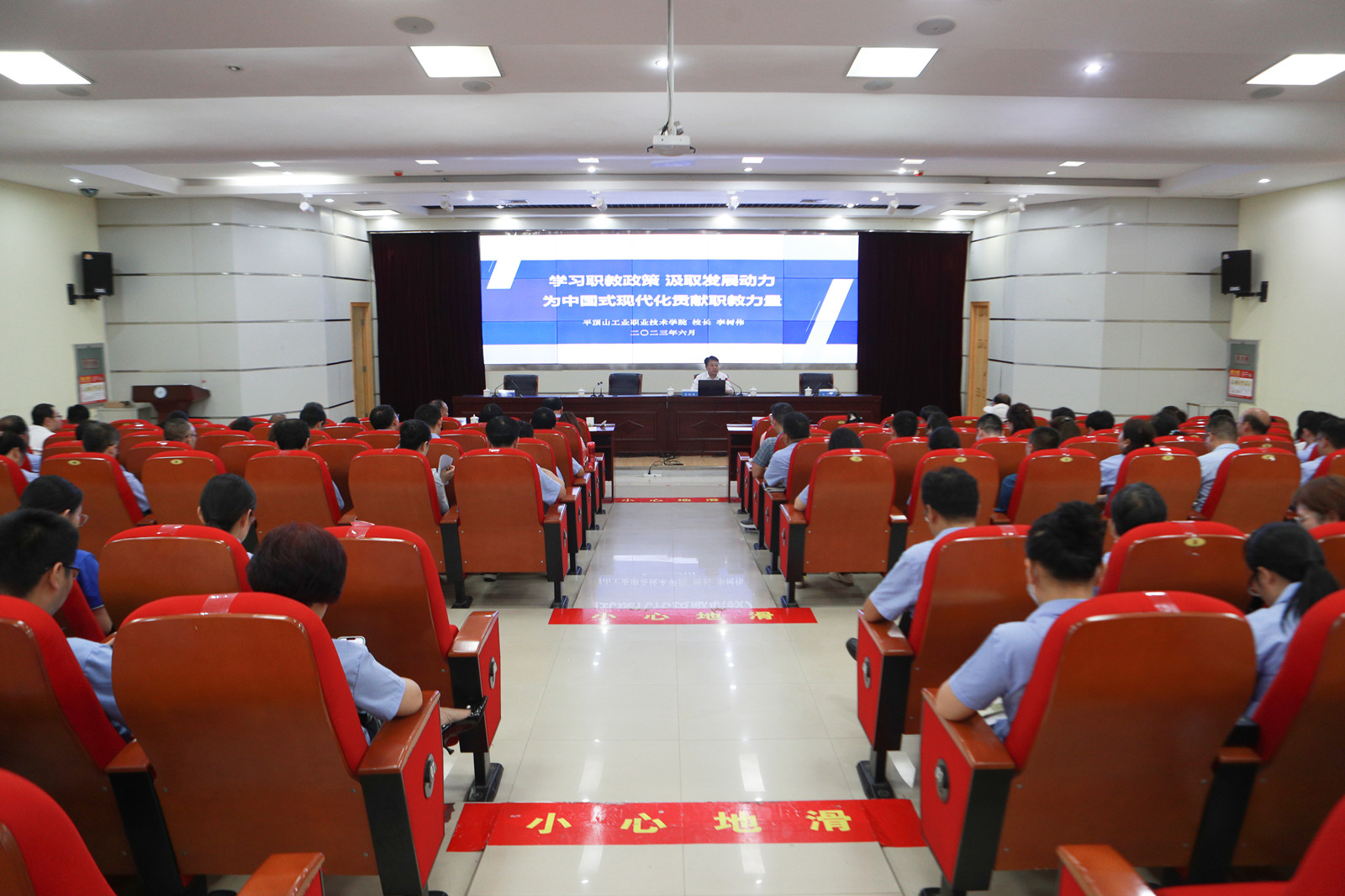 李树伟以《学习职教政策 汲取发展动力 为中国式现代化贡献职教力量》为题,对新修订的《职业教育法》《关于深化现代职业教育体系建设改革的意见》《职业教育产教融合赋能提升行动实施方案(2023—2025年)》等进行了全面详细解读。他指出,《职业教育法》的修订具有里程碑意义,充分彰显了国家对职业教育的重视,充分体现了新时代职业教育的历史定位,明确了职业教育发展的新方向。新职业教育法明确职业教育是与普通教育具有同等重要地位的教育类型,着力提升职业教育认可度,深化产教融合、校企合作,完善职业教育保障制度和措施,更好推动职业教育高质量发展。并从概念内涵、定位地位、管理体制、体系框架、办学层次、办学力量、证书制度、保障体系、民众关切等九个方面的突破,对新职业教育法进行了深刻阐释。结合《关于深化现代职业教育体系建设改革的意见》,他提出,《意见》集中体现了党中央、国务院部署职业教育改革新主张、新举措、新机制,是着力破解职业教育改革发展突出矛盾和问题的重大改革,是统筹职业教育、高等教育、继续教育协同创新的重要抓手,是推进职普融通、产教融合、科教融汇的关键步骤。针对《职业教育产教融合赋能提升行动实施方案(2023—2025年)》,他从围绕“赋能”和“提升”,提出的5方面19条政策措施,对文件进行了全面解读。他要求,学校要适应最新职教政策要求,持续优化职业教育专业布局结构,提高职业教育专业设置与市场需求的匹配度,培养更多高素质技术技能人才、能工巧匠、大国工匠。