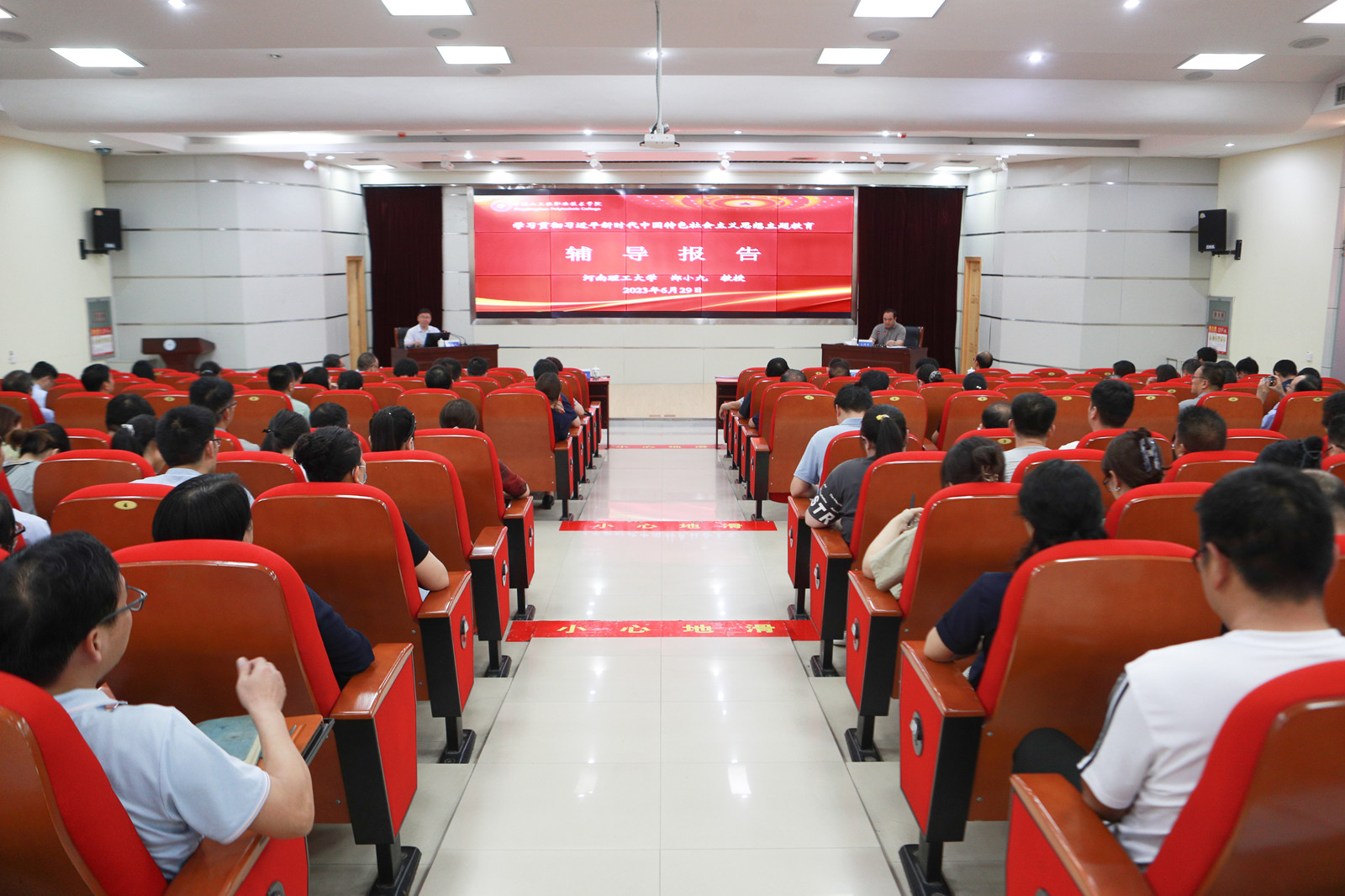 6月29日下午,学校在图书馆报告厅举行学习贯彻习近平新时代中国特色社会主义思想主题教育专家辅导报告会,邀请河南省委宣讲团优秀宣讲专家、河南理工大学马克思主义学院院长郑小九教授作辅导报告,所有在家校领导,副科级以上干部、各院部教研室主任、马克思主义学院全体教师,主题教育办公室全体同志200余人参加,报告会由校党委常务副书记、工会主席刘翱翔主持。