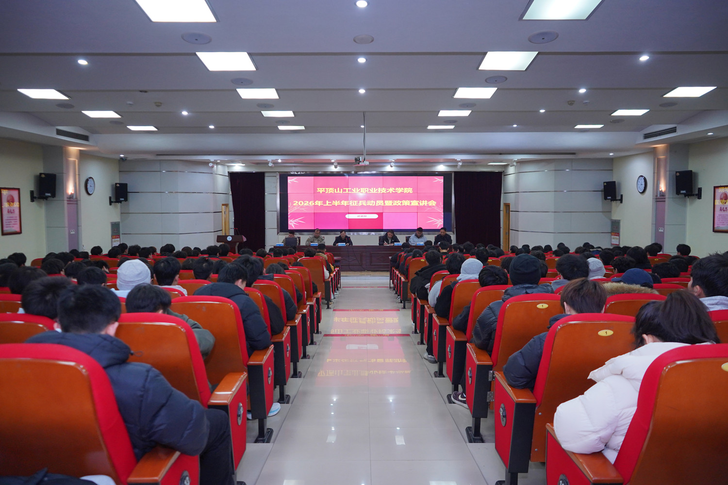 12月29日下午,我校在图书馆报告厅举办2026年征兵动员暨政策宣讲会。校纪委书记杜卫新、湛河区武装部参谋张帅等领导出席动员会,学校武装保卫部、学生处相关负责人,各院部学生工作代表及300余名学生参加。