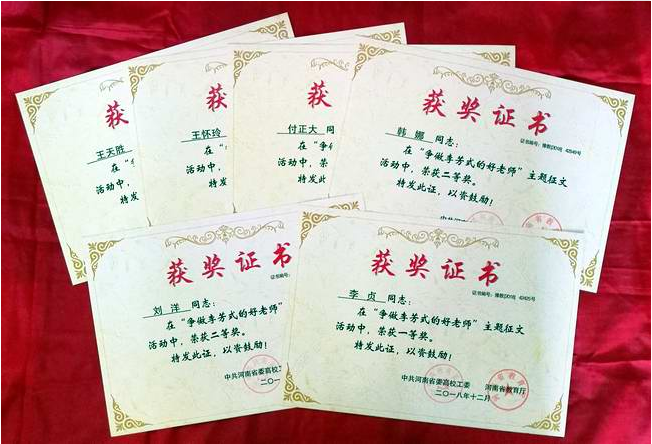 近日,河南省教育厅“争做李芳式的好老师”主题征文评选活动揭晓,我校李贞等6名教师主题征文获奖。其中,电力工程学院李贞老师撰写的征文《只要你要,只要我有》荣获一等奖;网络教育学院刘洋老师撰写的征文《用心耕耘育沃土,做李芳式的好老师》,电力工程学院韩娜老师撰写的征文《向李芳老师学习,争当李芳式好老师》荣获二等奖;经济管理学院付正大老师撰写的征文《立德树人,做李芳式好老师》,计算机与软件工程学院王怀玲老师撰写的征文《王卫东:男儿泪不轻弹,自古忠孝两难全》,武装保卫处王天胜老师撰写的征文《巾帼不让须眉的“女汉子”》荣获三等奖。