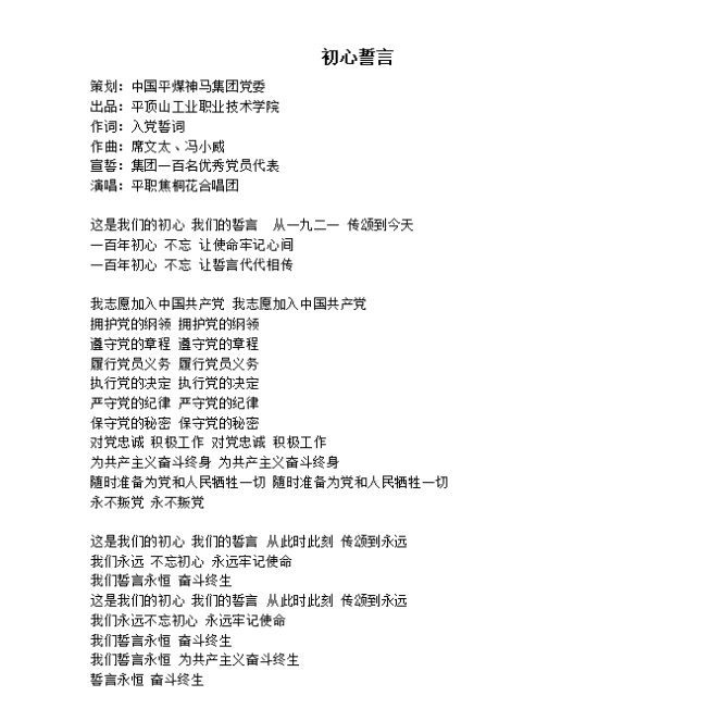 近日,由中国平煤神马集团党委策划,我校出品,平职焦桐花合唱团演唱的红色原创歌曲《初心誓言》全网发布,并于各大平台正式上线。