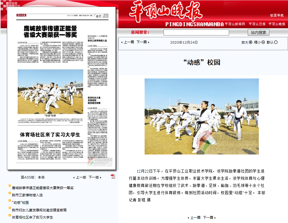 本报讯 (记者 彭程)12月22日下午,在平顶山工业职业技术学院,该学院跆拳道社团的学生进行基本动作训练。为增强学生体质,丰富大学生课余生活,该学院体育与心理健康教育部近期在学校组织了武术、跆拳道、足球、瑜伽、羽毛球等十余个社团,引导大学生进行体育锻炼。每到社团活动时间,校园里“动感”十足。