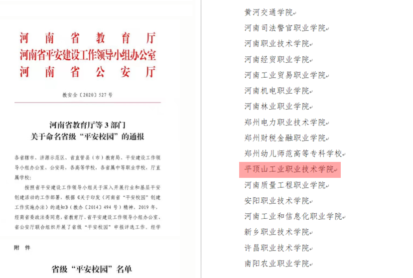 近日,河南省教育厅、河南省平安建设工作领导小组办公室、河南省公安厅三部门联合下发了《关于命名省级“平安校园”的通报》(教安全〔2020〕527号),我校获得了省级“平安校园”荣誉称号。