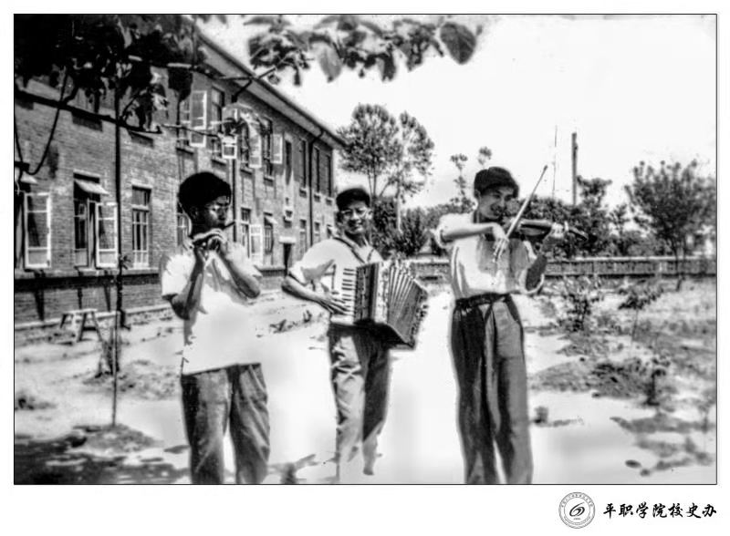 课余时间,煤校教师在练习乐器。拉小提琴的为物理教师杨焕成,拉手风琴的是制图教师古林,吹口琴的是制图教师栾建新。