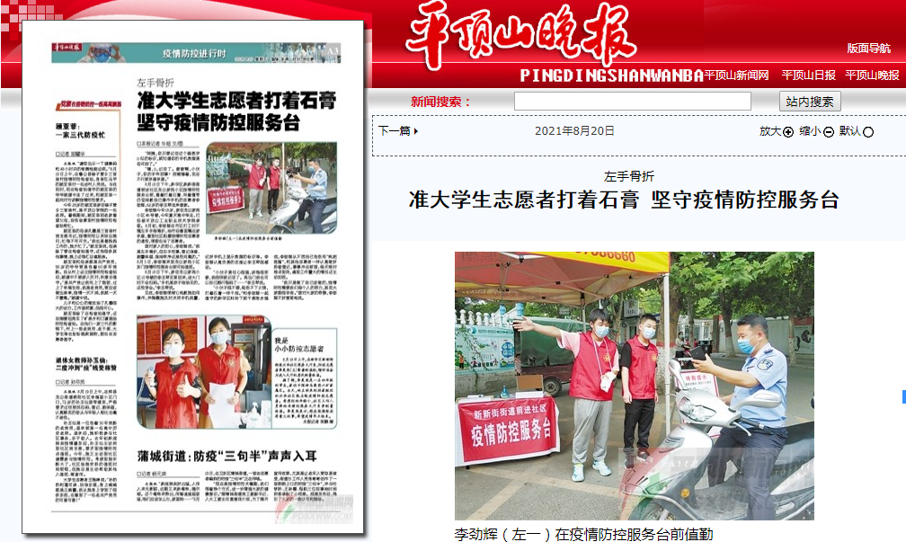 “小伙子很不错,轻伤不下火线,打着石膏一样干活。”和李劲辉一起值守的新华区科协下派干部张永强说,李劲辉从不因自己有伤而“挑肥拣瘦”,和其他志愿者一样认真做好排查登记,事事冲在前面,每天准时准点到岗,遇到工作量大的情况还主动加班。