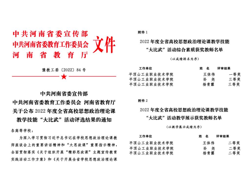 近日,由中共河南省委宣传部、中共河南省委教育工委、河南省教育厅主办的2022年度全省高校思想政治理论课教学技能“大比武”活动评选结果揭晓,我校马克思主义学院教师王体伟获得综合素质一等奖、教学展示二等奖,教师杨青露、孙尧获得综合素质三等奖、教学展示二等奖。
