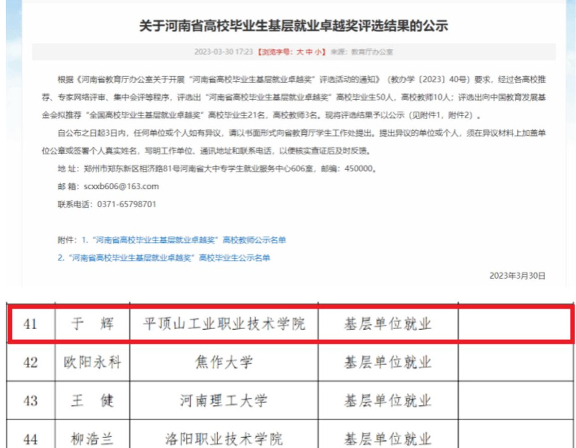 近日,河南省教育厅办公室发布“河南省高校毕业生基层就业卓越奖”评选结果公示名单,我校2016届毕业生于辉荣获“河南省普通高校毕业生基层就业卓越奖”。