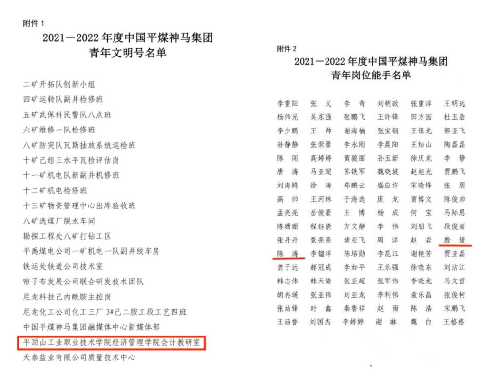 近日,我校青年集体经济管理学院会计教研室荣获2021-2022年度“中国平煤神马集团青年文明号”称号,青年教师殷媛、陈涛荣获“青年岗位能手”称号。