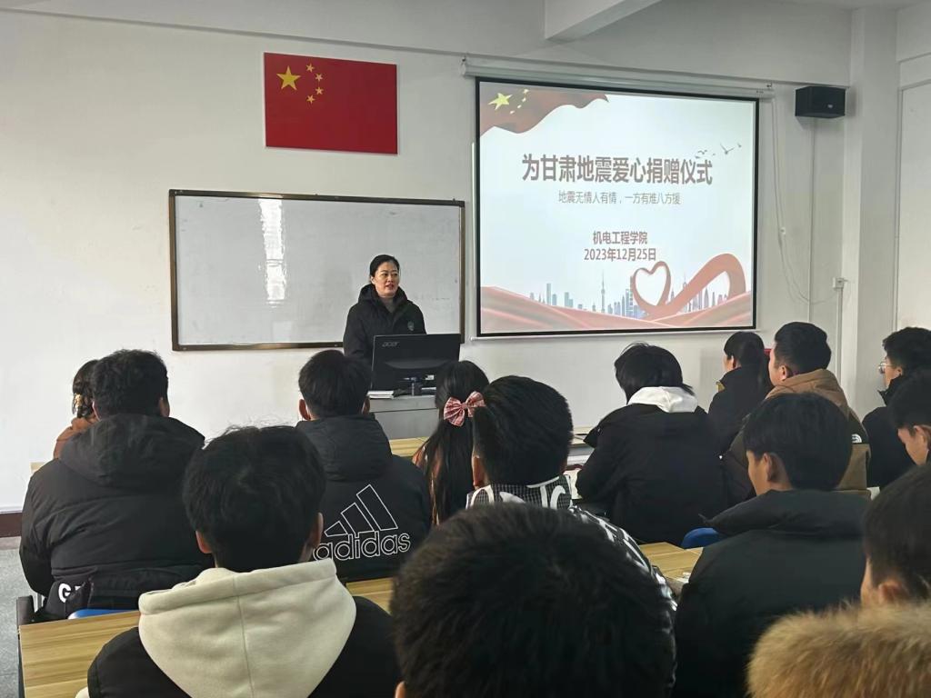 一方有难,八方支援。2023年12月25日,机电工程学院师生举行向甘肃临夏州积石山县地震灾区救灾捐赠仪式,募捐活动共筹集善款4811.5元,现场已通过河南慈善联合总会全部捐赠给地震灾区,用于帮助灾区人民渡过难关,重建家园。募捐中,机电工程学院领导、各班代表陆续捐款,师生一边踊跃捐款,一边诵读感恩词,发自内心的为灾区群众做点事。涓滴之水,终能汇流成河,捐赠不论多少,善举不分先后,机电工程学院师生贡献出自己的绵薄之力,也彰显了学校师生与灾区人民同心同行同力的决心。让我们共同祈祷甘肃积石山地震灾区的人民能够早日走出灾难的阴影,重建美好家园。同时,也为我校全校师生点赞,他们用实际行动诠释了“风雨同舟 携手同行”的真谛。