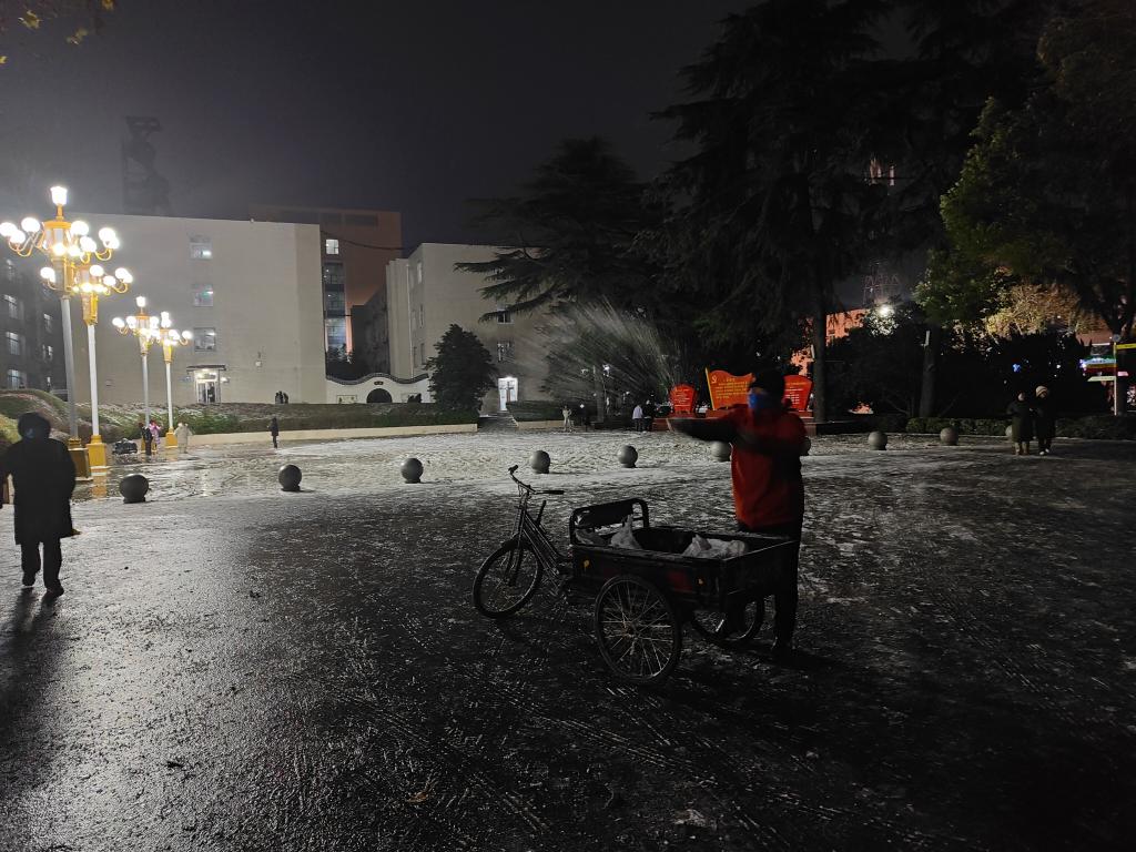 2023年12月14日晚至15日,受强冷空气影响,平顶山市迎来了2023年的第一场大范围降雪。为应对强降雪寒潮天气,全面保障校园师生的生命安全,后勤基建处的同志们自发组成除雪志愿服务队,让平职的文化路熠熠生辉。除雪志愿服务队脚蹬三轮,慢慢的向路面撒盐,防止路面结冰;他们手拿除雪工具,对学校的各出入口、主次干道的积雪冻冰进行全面清扫。尽管天气寒冷,但大家热情高涨,在他们的带动下,许多师生也纷纷下楼参与到清除积雪工作中,经过大家的不懈努力与默契配合,很快就在校园清理出了一条条“平安路”、“暖心路”,保障了校区道路的安全畅通。他们不仅彰显出为师生服务的情怀,也架起了学校与师生之间的连心桥。
