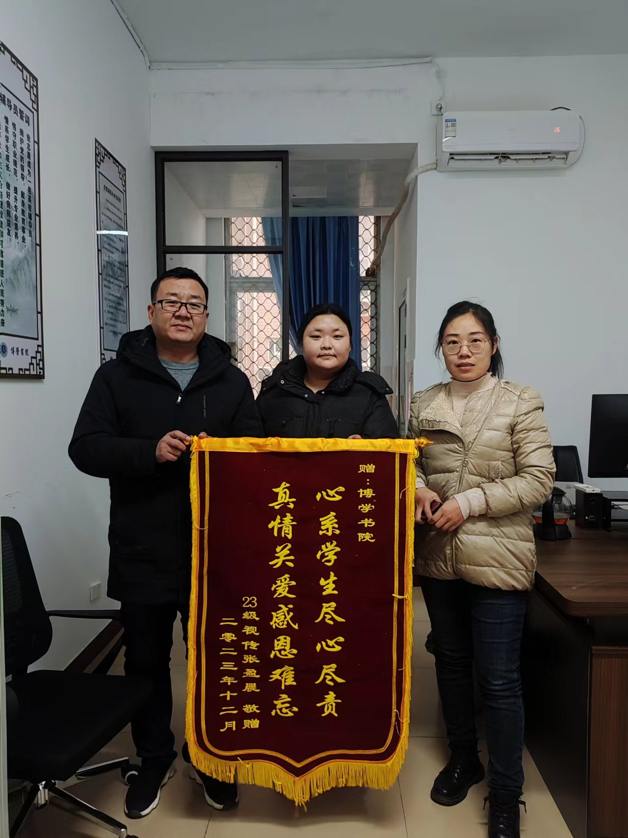锦旗递真情,师爱暖人心!2023年12月18日,博学书院收到了一份特殊的礼物——来自23级视觉传达设计专业学生张盈晨送来的写有“心系学生尽心尽责真情关爱师恩难忘”的两面锦旗,以此表达对史会娟等四位老师关爱学生、热心助人的感激之情。2023年12月11日清晨,博学书院专职辅导员史会娟老师在博雅苑工作时,宿管阿姨告诉史老师,张盈晨的手机昨天丢失在了学校北门附近,学生很焦虑,彻夜未眠。史老师和宿管阿姨急学生之所急,立即赶往学校监控室查看监控录像,他们通过查询比对,发现手机被沿途经过的一名女生捡到了。随后,史老师在博学书院副院长尹锦锋和学校宿管中心主任石松慧的帮助下,联系到了捡到失物的女生,该女生也于当日将手机物归原主。张盈晨感动地拥抱着史老师激动地说:“老师,我真的没想到,手机还能找回来,真的是解决了我学习、生活的燃眉之急,感谢同学,感谢老师......”。一面锦旗是一段故事、一份真情更是一个缩影,我校的教师队伍始终用实际行动践行社会主义核心价值观,传递社会正能量!