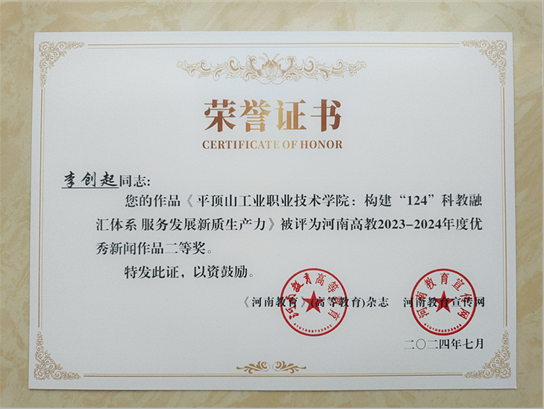 学校被授予“河南高校2023—2024年度宣传先进单位”卓越奖,党委宣传部马金被评为年度“优秀通讯员”,学校推荐的新闻作品《构建“124”科教融汇体系 服务发展新质生产力》获评优秀新闻作品二等奖。