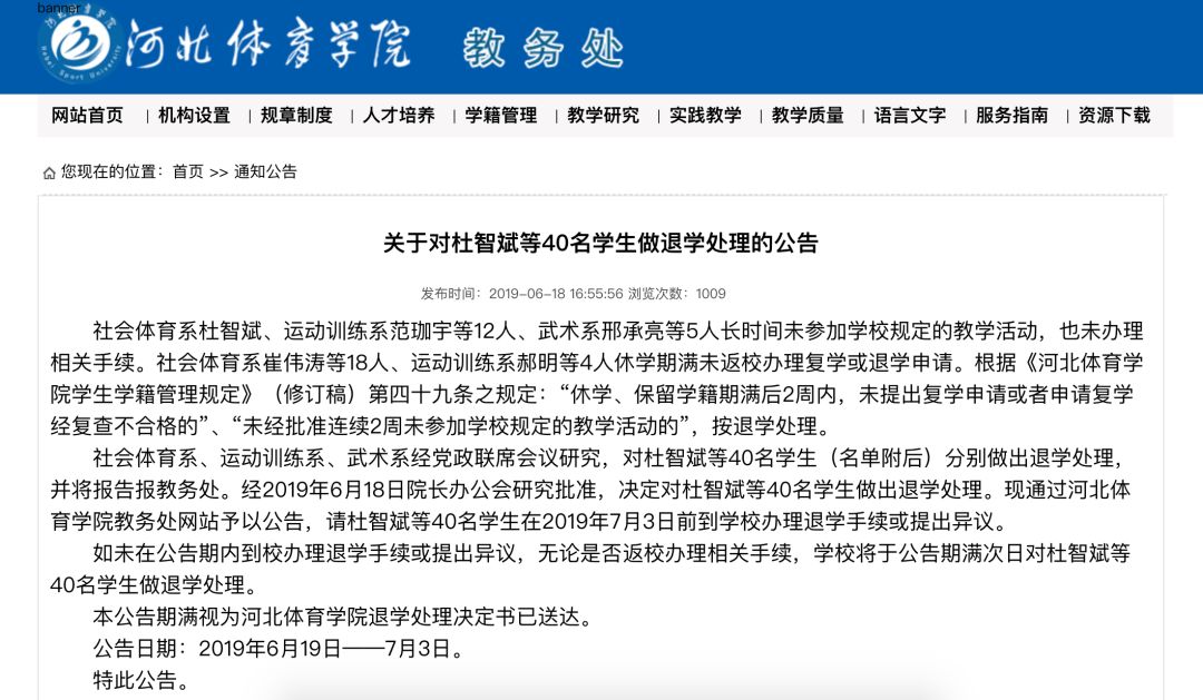 公告还注明:“现通过河北体育学院教务处网站予以公告,请40名学生在2019年7月3日前到学校办理退学手续或提出异议。