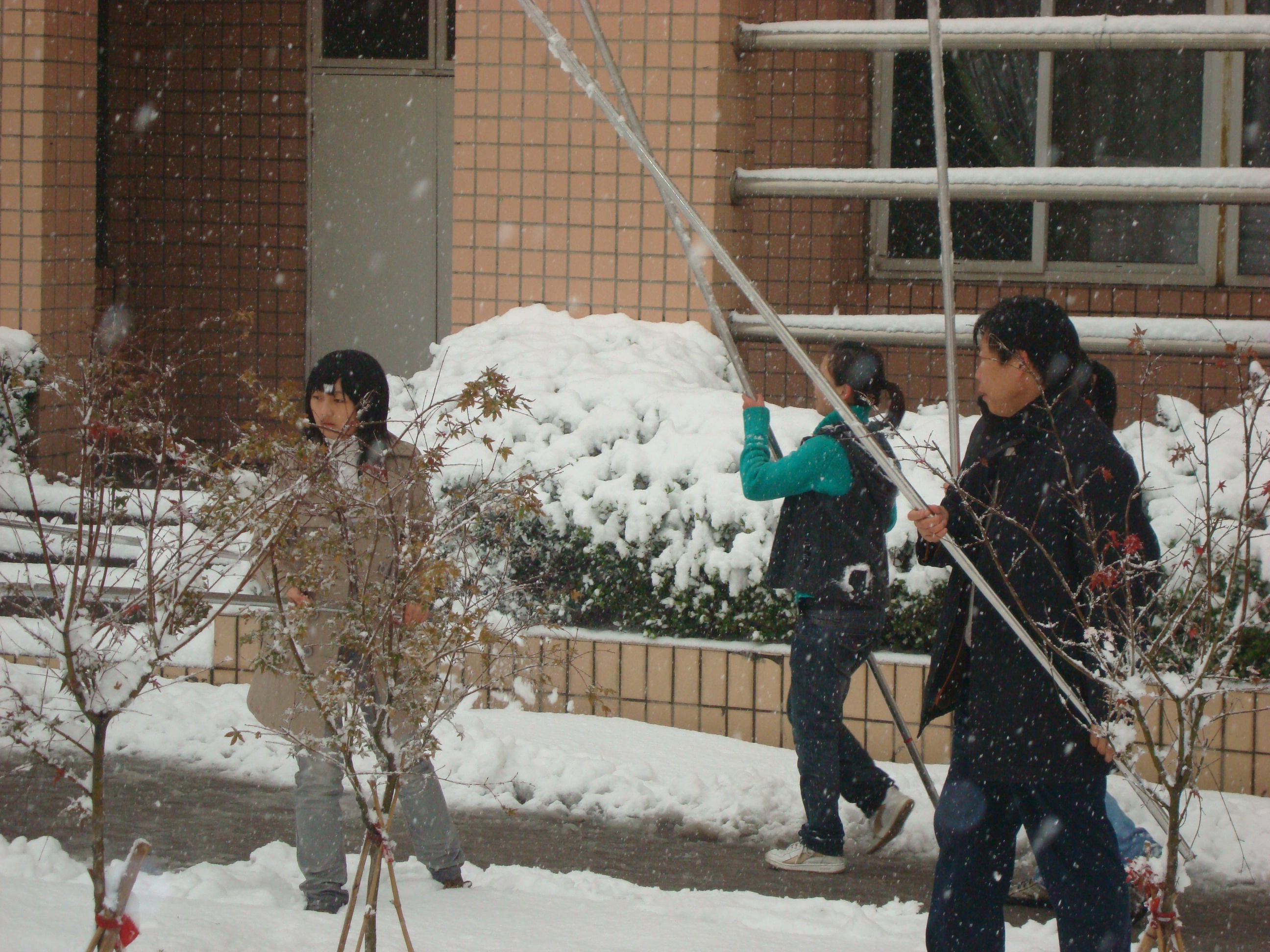 2009年入冬的第一场大雪把校园装扮的银装素裹,分外妖娆。但是多年不遇的大雪飘落在小树上,小树一棵棵被压弯了腰,不堪重负。为了不让小树受到损害,学工部组织院学生会干部、五年制大专学生干部为小树“减负”。学工部领导和学生干部一起手持竹竿、旗杆,轻轻地敲打掉覆盖在一棵棵小树上面的厚厚的积雪,敲落的积雪落在身上、头上,钻进了脖子里,冰凉冰凉的,他们不在乎,手冻僵了,他们搓一搓,继续干,经过两个多小时的战斗,校园内的小树一个个都抬起了头,傲雪挺立,为雪中的校园平添了几分冬韵。