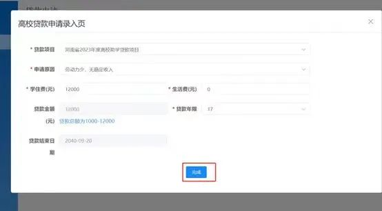 2.确认贷款年度,选择贷款原因,在学住费栏填入本年度“学费+住宿费”合计金额;生活费栏自由填写,需为100的整数倍;贷款年限、贷款结束日期(即贷款到期日期)根据学生所填年级、学制自动生成。