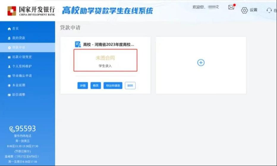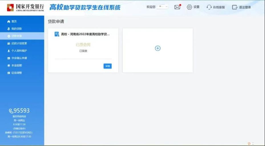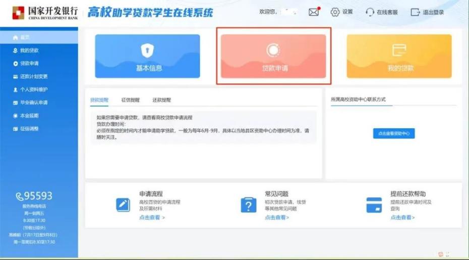 1.通过手机号登录国家开发银行学生在线服务系统,进入界面后选择贷款申请。