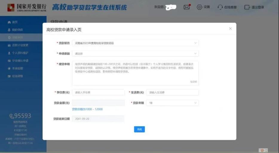 2.确认贷款年度,选择申请原因,按要求如实填写续贷声明,在学住费栏填入本年度“学费+住宿费”合计金额;生活费栏自由填写,需为100的整数倍;贷款年限、贷款结束日期(即贷款到期日期)根据学生所填年级、学制自动生成。