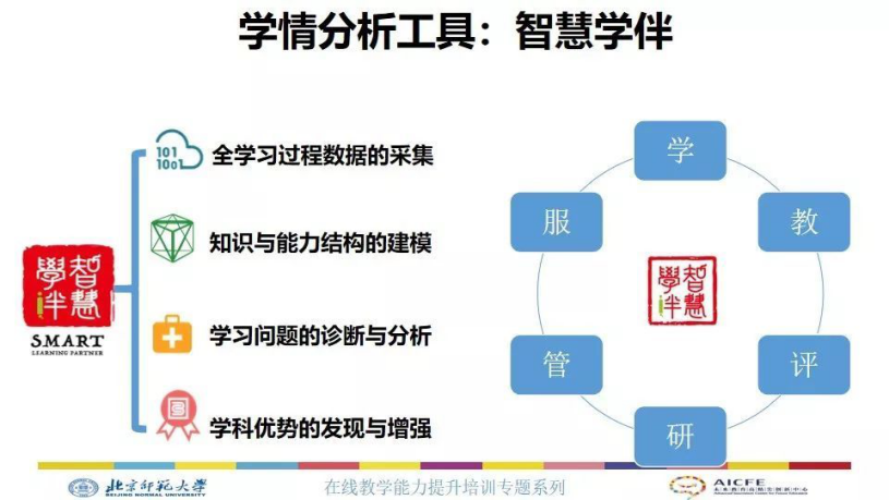 常见的学情分析工具,我以我们研发的一个智慧学伴为例,它可以实现全学习过程数据的采集、知识与能力结构的建模、学习问题的诊断与分析、学科优势的发现与增强。采集学生学习过程中的数据,通过数据对学生知识的能力结构坚决建模,建模以后通过对学生能力结构的建模和可视化,对学生的学习问题进行诊断分析,然后发现学生的学科优势,增强学生的学科优势。