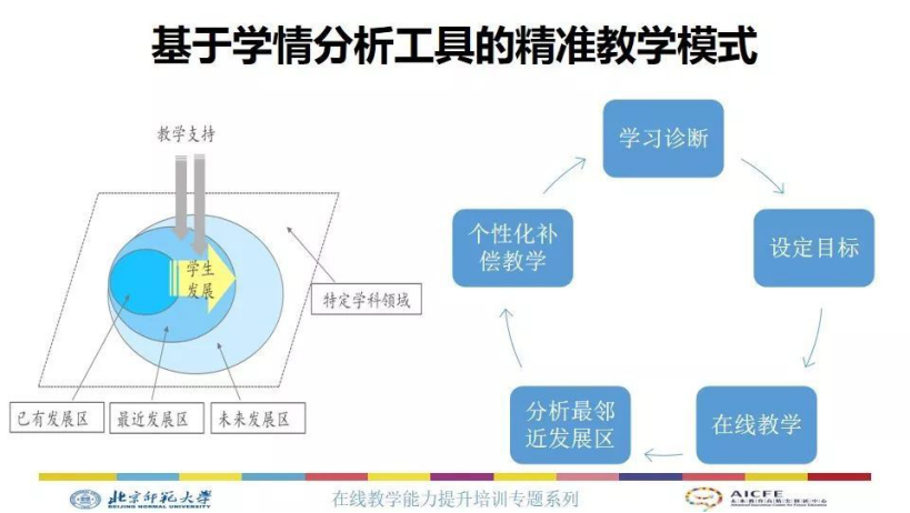 这种基于学情分析工具的精准教学模式,它基本上包括学情诊断、设定目标、在线教学、分析最临近发展区、个性化补偿教学这五个关键步骤。最重要的是要利用学生学习过程中产生的数据,分析学生已有的发展区和最临近的发展区,在学生最临近发展区的时候教师相继提供相应的支持,相应的学习服务,引导学生在最临近发展区的可持续性的发展。