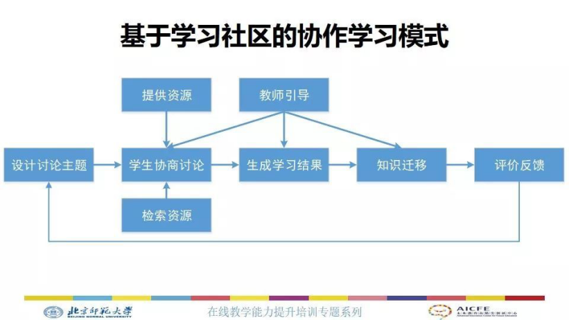 这种基于学习社区的协作学习模式,一般来说教师首先设计讨论的主题,然后给学生提供一些资源,设计一些活动,然后学生进行学生讨论,同时还可以检索一些资源,进一步地丰富问题的讨论。然后基于这些讨论,生成学习的结果,然后做知识迁移,最后达成对知识的深刻理解,在这个过程中教师对整个学生的参与过程进行整体的引导,进行评价和反馈,这是典型的这种基于学习社区的学习模式。